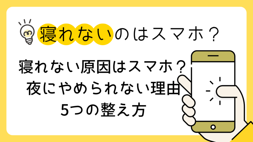 寝れない原因はスマホだけではありません。しかし、寝れない原因スマホと検索する人が増えている通り、夜のスマホ習慣は睡眠に強い影響を与えています。特に寝る前スマホやめられない、眠れないスマホ見ちゃうという状態は、脳が休む準備に入れないサイン... -